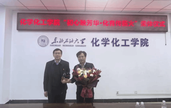 在热烈的掌声中,司国海、陈彦广向两位荣休教师敬献鲜花,并颁发荣休纪念品,以此表达学院的崇高敬意与真挚感谢。
